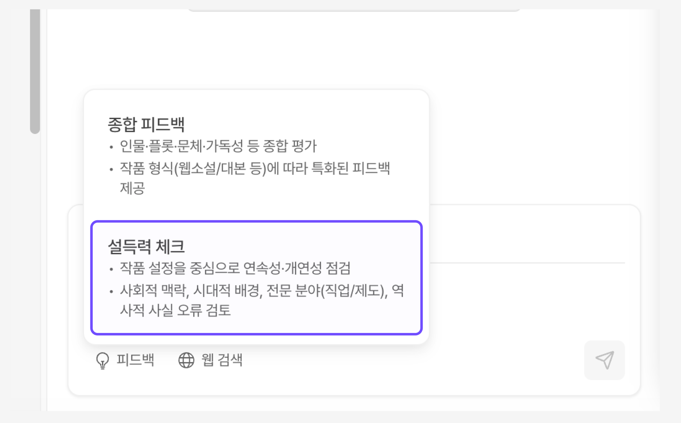작품의 객관적인 개연성과 고증을 검토해주는 새로운 피드백 모드가 추가되었습니다. 이제 AI 피드백을 두 가지 관점에서 활용해 보세요.