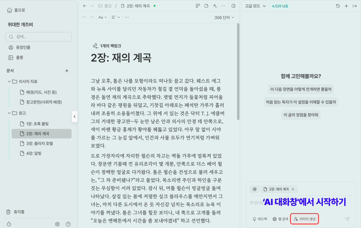 등장인물 페이지에서 ‘인물 이미지 생성’ 버튼을 눌러서 시작하실 수도 있습니다.